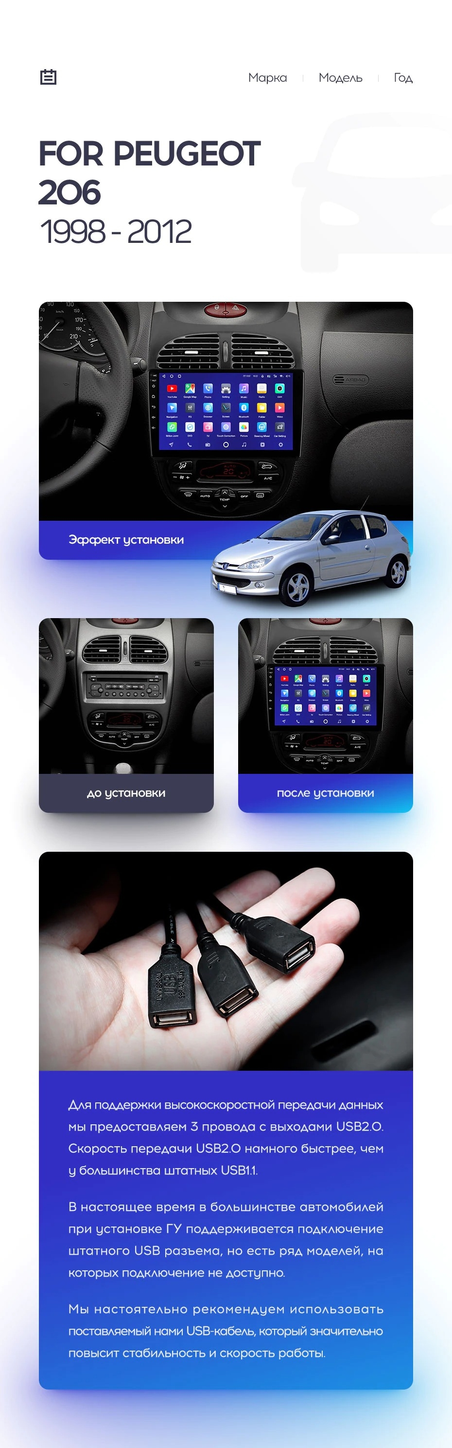 Полный комплект установки магнитолы Teyes с рамкой и проводкой можно выбрать в каталоге штатных магнитол Peugeot 206 (1998-2012).