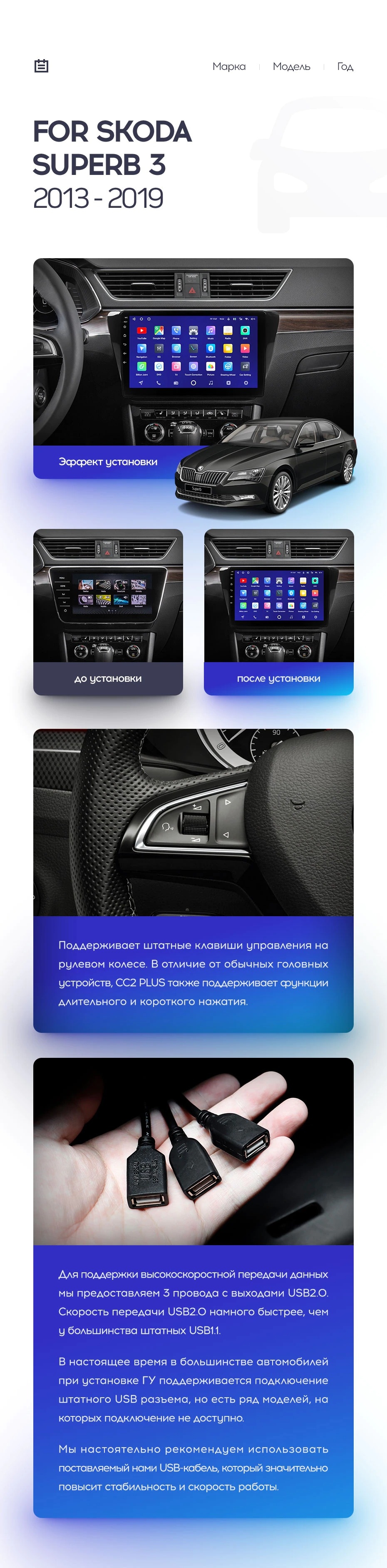 Полный комплект установки магнитолы Teyes с рамкой и проводкой можно выбрать в каталоге штатных магнитол Skoda Superb 3 (2015-2019).