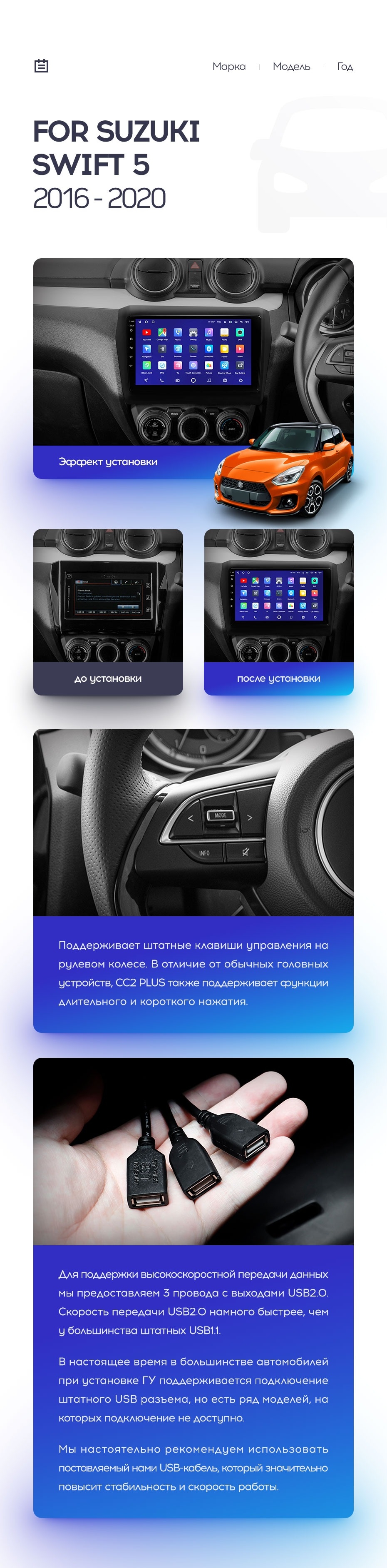 Полный комплект установки магнитолы Teyes с рамкой и проводкой можно выбрать в каталоге штатных магнитол Suzuki Swift 5 (2016-2020).